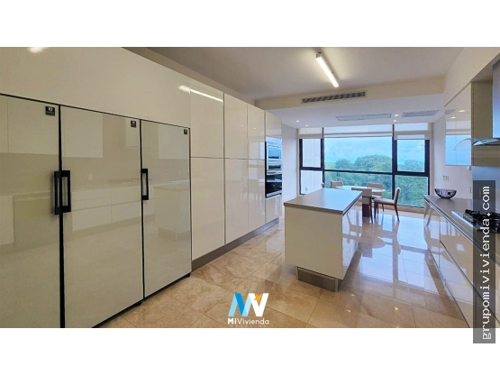 El apartamento cuenta con una cocina completa con cuarto de despensa y área de lavandería. La zona de descanso ofrece una recámara principal con baño privado y un práctico walk-in closet, además de dos recámaras secundarias, cada una con su propio baño completo. Para mayor comodidad, también dispone de un baño de visita y una recámara de empleada. Toda la propiedad cuenta con un eficiente sistema de aire central para garantizar un ambiente agradable en todo momento.